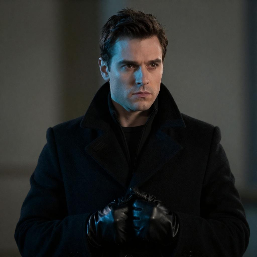 Photograph of a movie poster featuring a dark, industrial setting. A man with short, dark hair and a white shirt leans forward, gripping a metal surface. The background is shadowy with industrial equipment. Text and a smaller image of a woman in a red dress are in the bottom left corner.