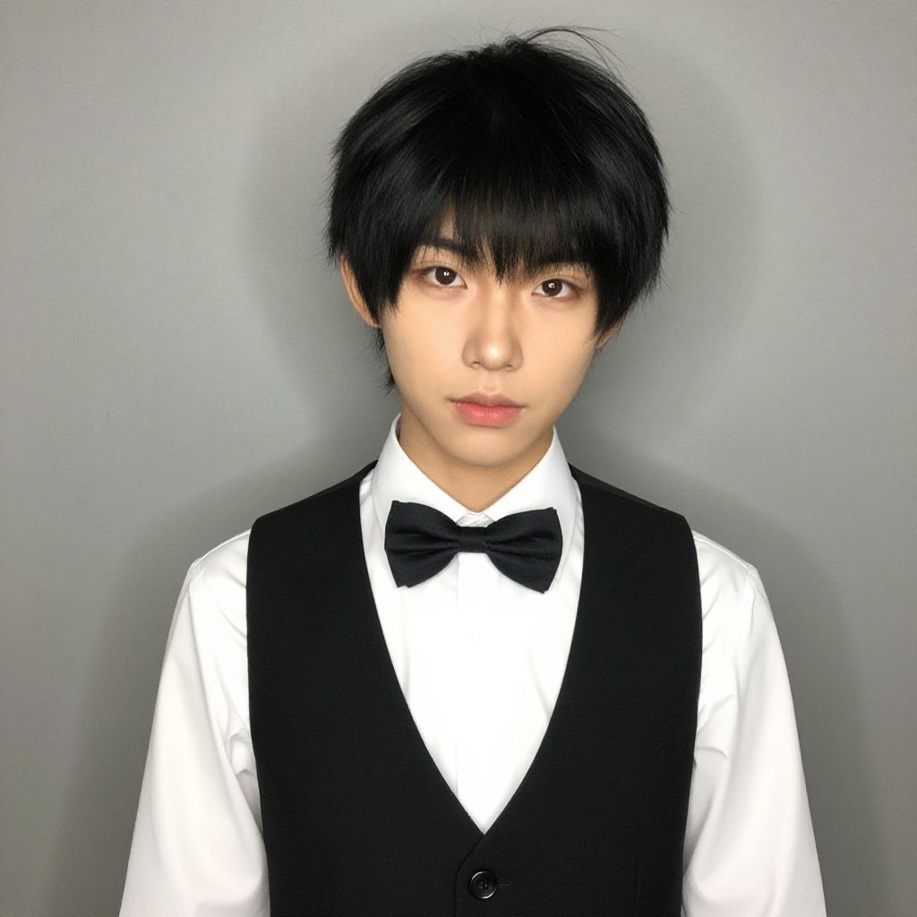 Young Asian male in black and white maid outfit with white apron and headpiece, standing in a softly lit, minimalist room. Photorealistic CGI