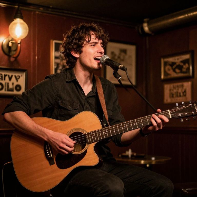 Photograph of a young white man with curly brown hair and fair skin, sitting and playing an acoustic guitar while singing into a microphone. He wears a black button-up shirt with rolled sleeves and black pants. The background is a dimly lit, wood-paneled room with framed pictures, a wall-mounted light fixture, and a "Barry Dilo" sign. The warm, amber lighting casts a cozy atmosphere. The musician's eyes are closed, and his expression is focused and passionate. The guitar has a natural wood finish.