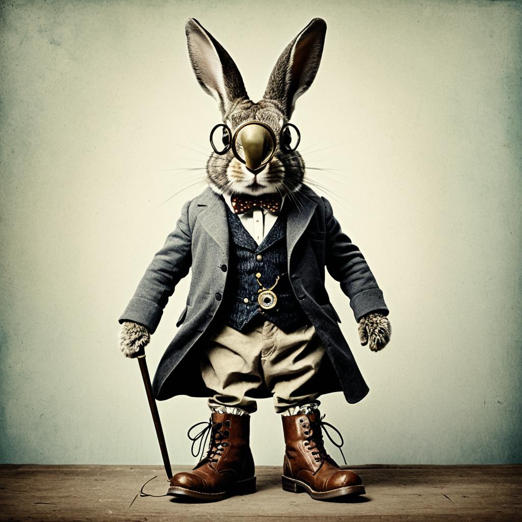 Surreal image of a rabbit standing upright wearing a gray coat, waistcoat, bow tie, beige pants, oversized brown boots, and a monocle. The rabbit holds a cane, dressed in a humorous and vintage style with muted colors.