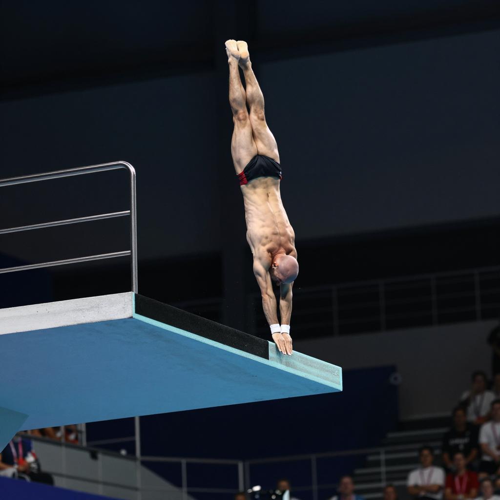 A photograph of a male aerialist performing at night. He has short, dark hair and tattoos on his right arm. He is shirtless, wearing brown pants and a white strap across his chest. He holds a rope with both hands, hanging mid-air. The background is a blurred cityscape with bright lights. His facial expression is focused and intense. The rope is centered in the image.