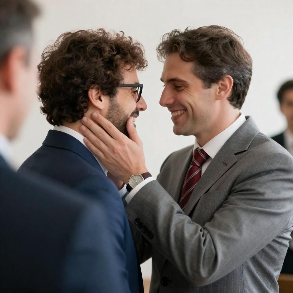 Photograph of two men in a close embrace. The man on the right, in a gray pinstripe suit and red-striped tie, smiles warmly while holding the other man's face with his right hand. The man on the left, with curly brown hair and glasses, laughs, wearing a blue suit. Another person's blurred face is in the foreground. Bright indoor setting, warm lighting.