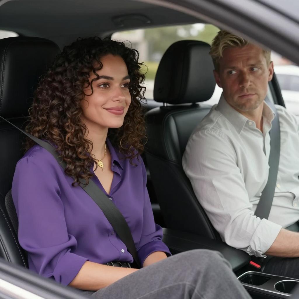 Photograph of a man with a receding hairline, pale skin, and light blue eyes, wearing a beige jacket, looking slightly to the left. Behind him, a woman with curly dark hair and medium brown skin, wearing a gray blazer and gold necklace, looks directly at him with a subtle smile. They are in a dimly lit car with red upholstery. The background is dark with faint streetlights.