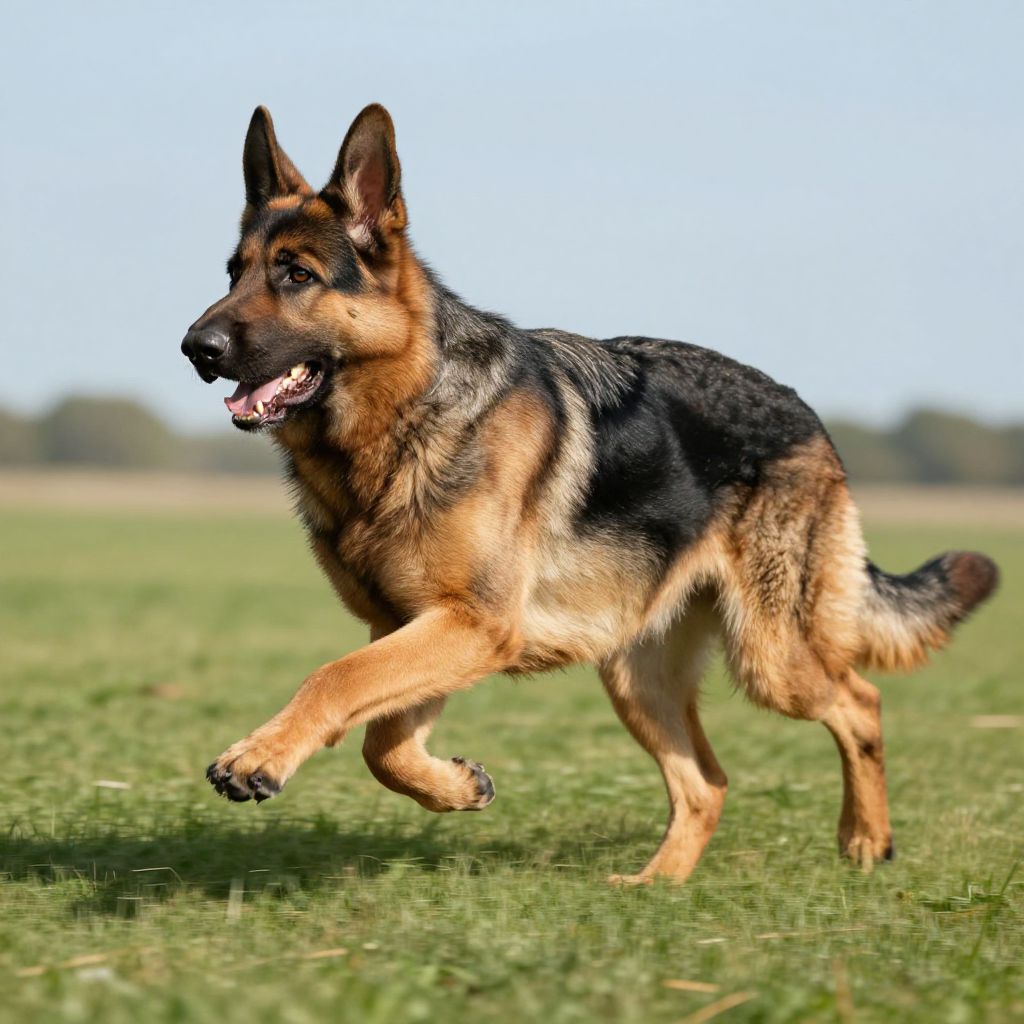 GSD German Shepherd Dog running energetically across a grassy meadow, dynamic motion blur, vibrant natural colors, clear sky background, highly detailed and lifelike depiction