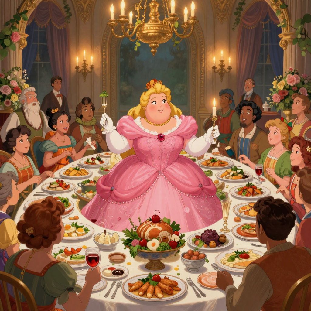 Digital illustration of a fairy tale dinner with a large, smiling blonde princess in pink gown holding candles, surrounded by diverse guests in formal attire, enjoying a
