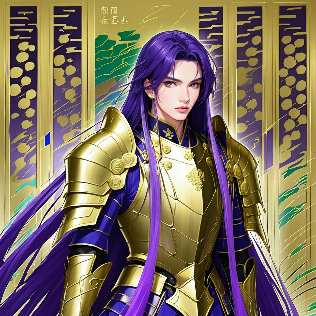Hachisuka kotetsu, touken ranbu, 1boy, blue eyes, green eyes, purple hair, long hair, very long hair, gold armor, armor, gold armor, armor, by artist qing wu, anime