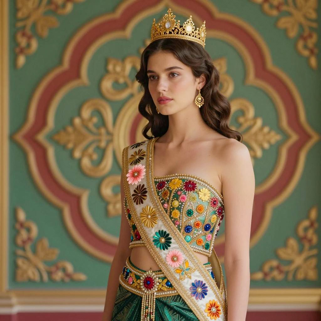 Photograph of a young woman with fair skin, dark brown wavy hair in an updo, wearing a gold crown. She has a slender build, small breasts, and wears a strapless, elaborately decorated gown with colorful floral patterns, beads, and green fabric. She stands with her right arm slightly behind her back, head turned slightly to the left, looking forward with a neutral expression. The background is an ornate, green and red patterned wall. She wears gold earrings and a sash with a flower at the center of her chest.