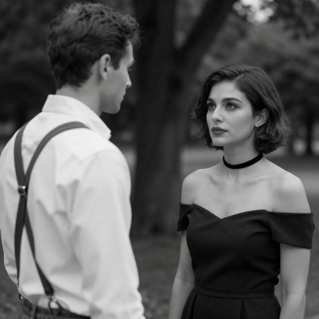 Black-and-white photograph of a man and woman facing each other outdoors. The man, with short dark hair, wears a white shirt with suspenders. The woman, with short dark hair, wears a black off-shoulder dress and a choker. They stand in front of a tree, with the woman looking to the right and the man looking at her.