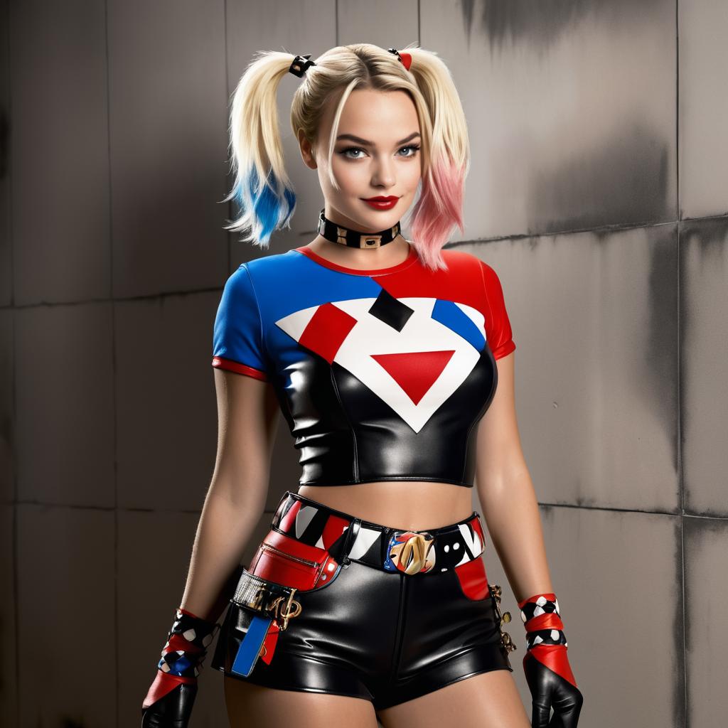 Photoshoot of Margot Robbie as Harley Quinn, magazine-style, high resolution, 8K, detailed.