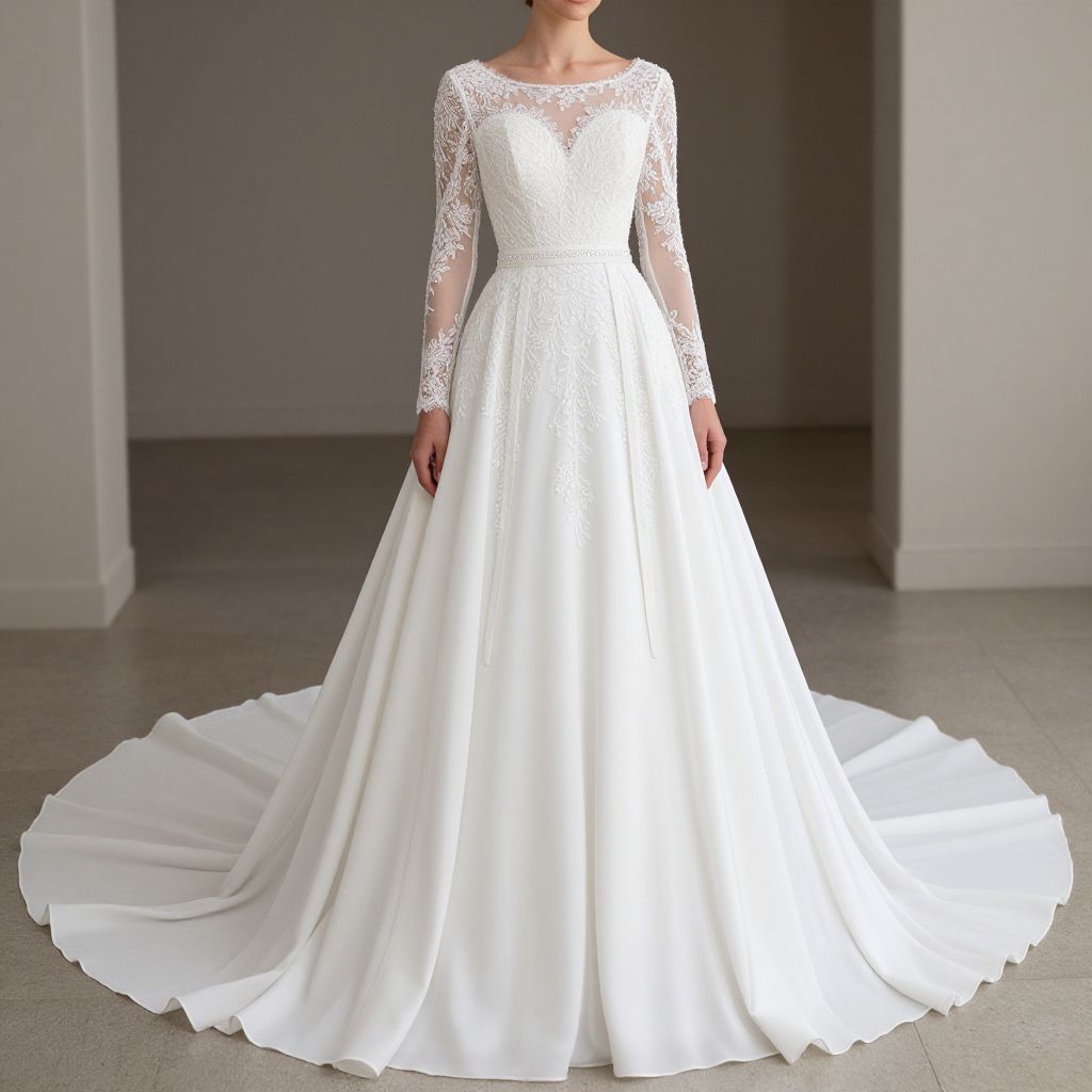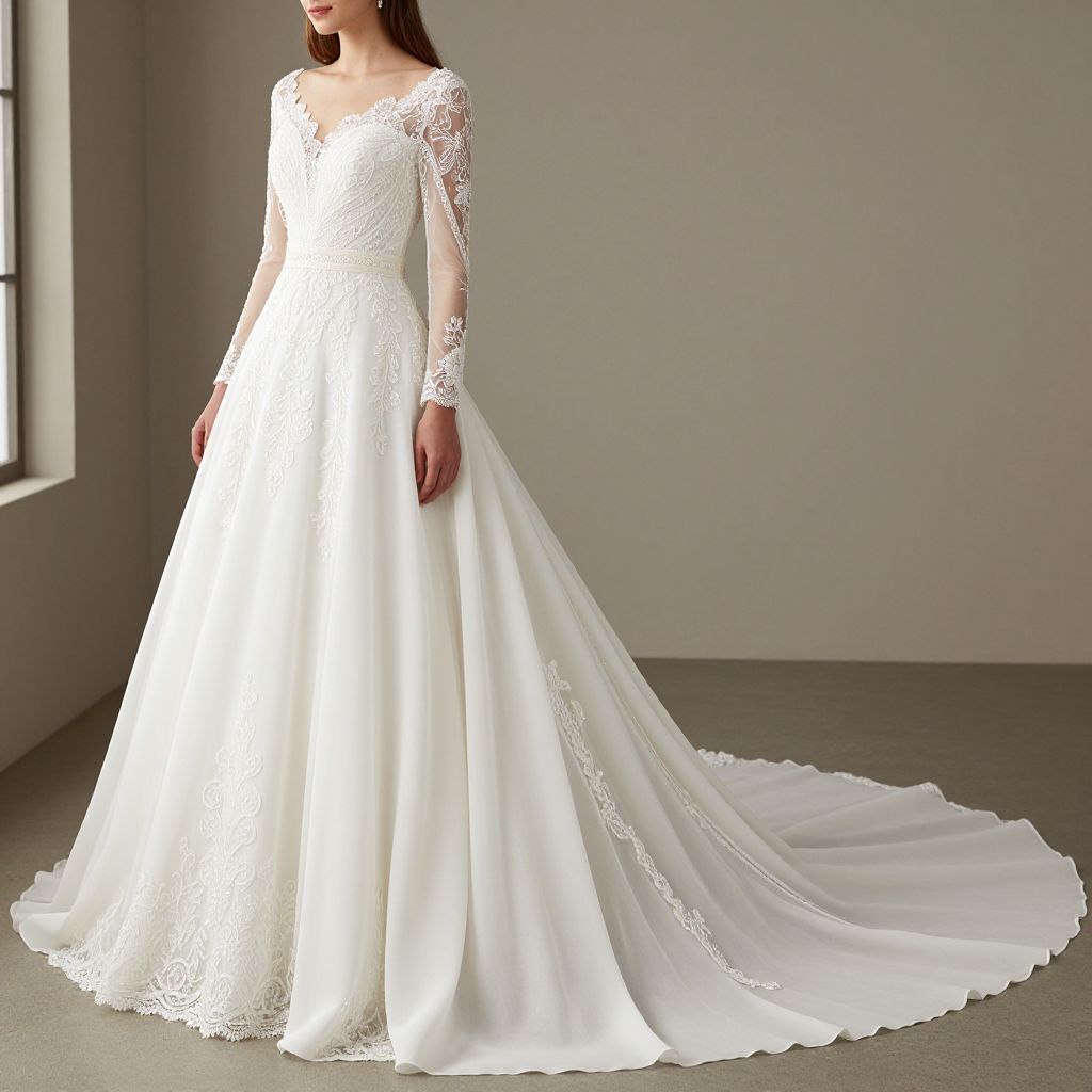 A woman elegantly showcases an A-line princess wedding dress featuring a scalloped neckline, long sleeves, and a sweeping train crafted from flowing chiffon, adorned with delicate lace sashes and embellished with intricate beadwork, captured in a high-definition photograph with soft, natural lighting.