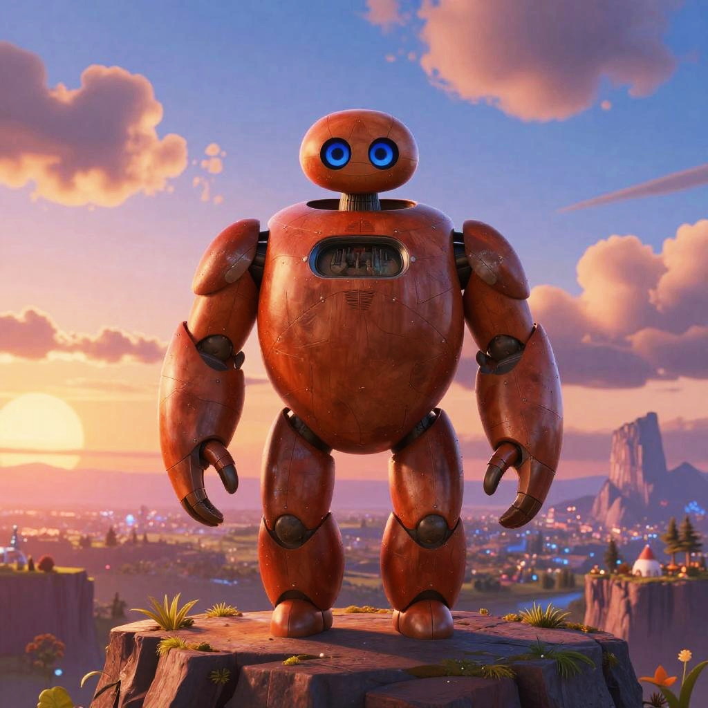AI Disney Pixar style heroic android standing on a cliff at sunset overlooking a magical landscape, epic and uplifting mood, rich colors, stylized clouds, detailed character design with emotive eyes, painterly background
