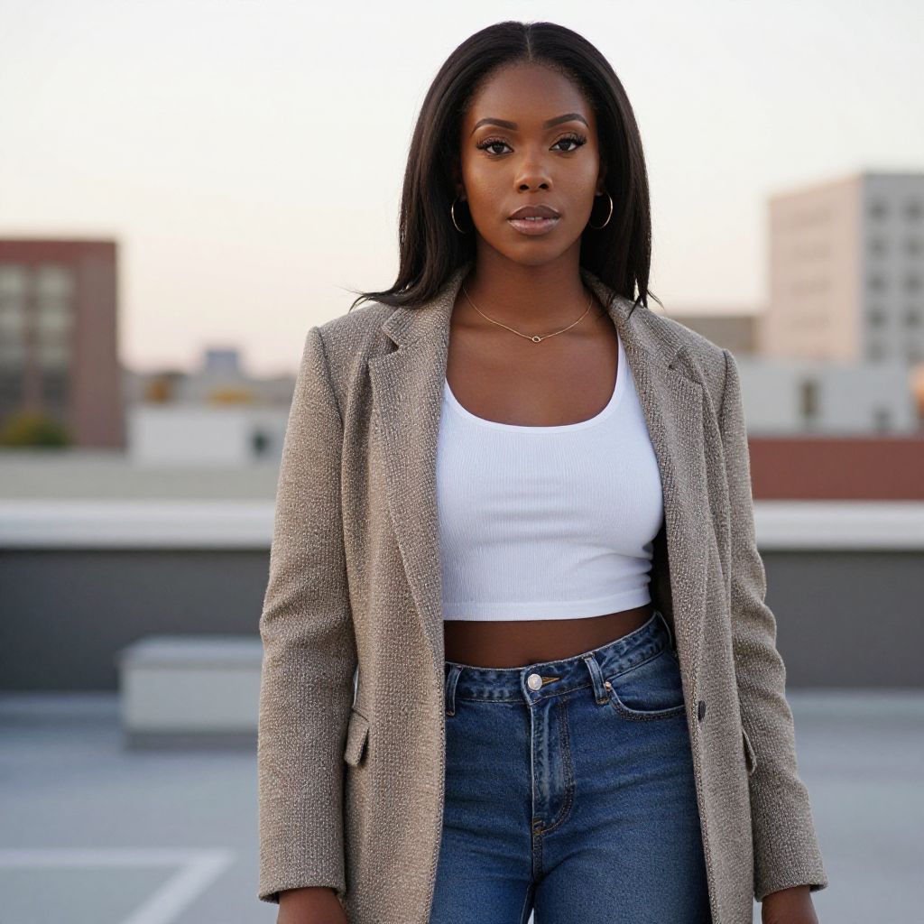 Photograph of a confident Black woman with long pink wavy hair, wearing a white crop top, gray blazer, and black pants, standing on