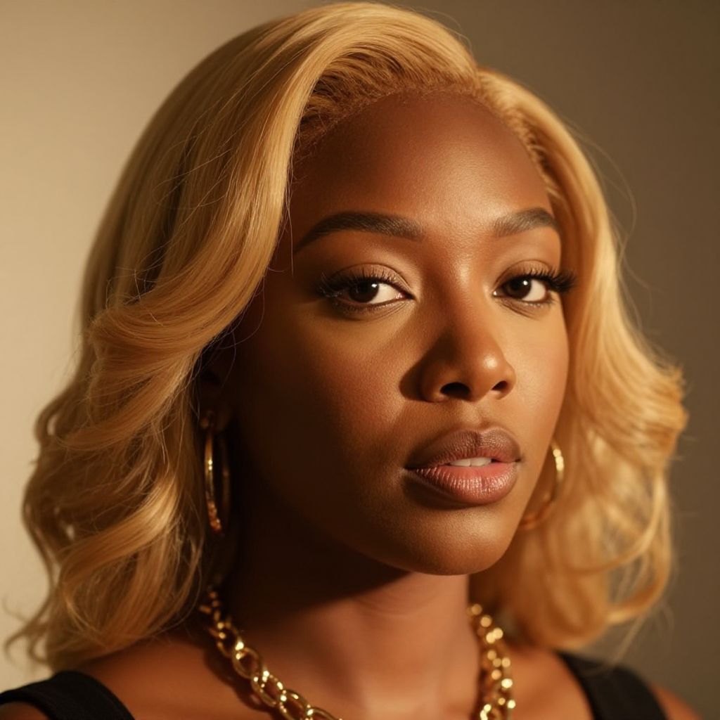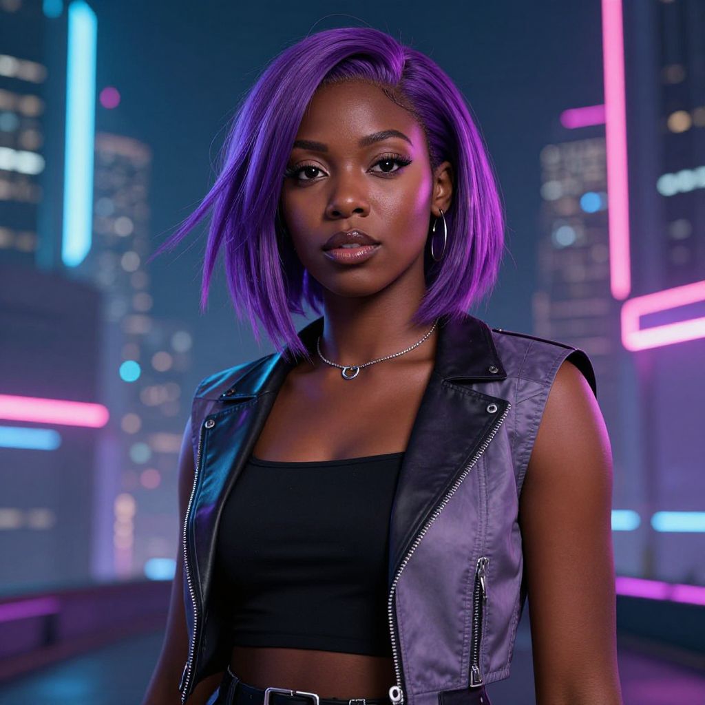 Black woman pink hair styled in loose waves, wearing a modern urban outfit, standing in a vibrant city street at sunset, neon signs glowing in the background, soft natural lighting highlighting her confident expression and colorful hair.