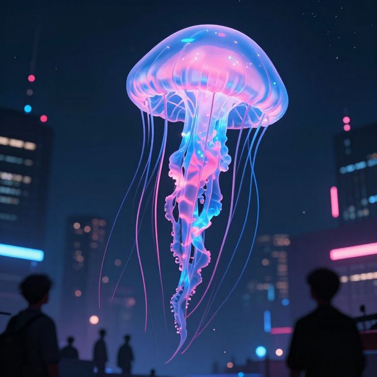 Photograph of a glowing, neon blue and pink jellyfish floating above a dark, cityscape with silhouetted people and illuminated buildings in the