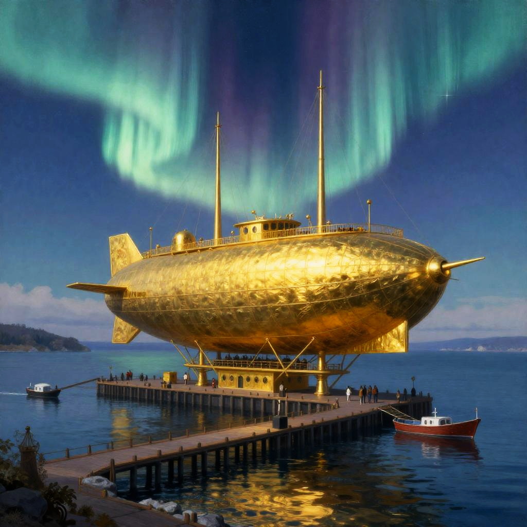 A gilded airship harbor set in a aurora-lit polar archipelago, inspired by Maxfield Parrish. This artwork emphasizes intricate details and is rendered in stunning 8k resolution, showcasing vibrant colors and a captivating atmosphere.