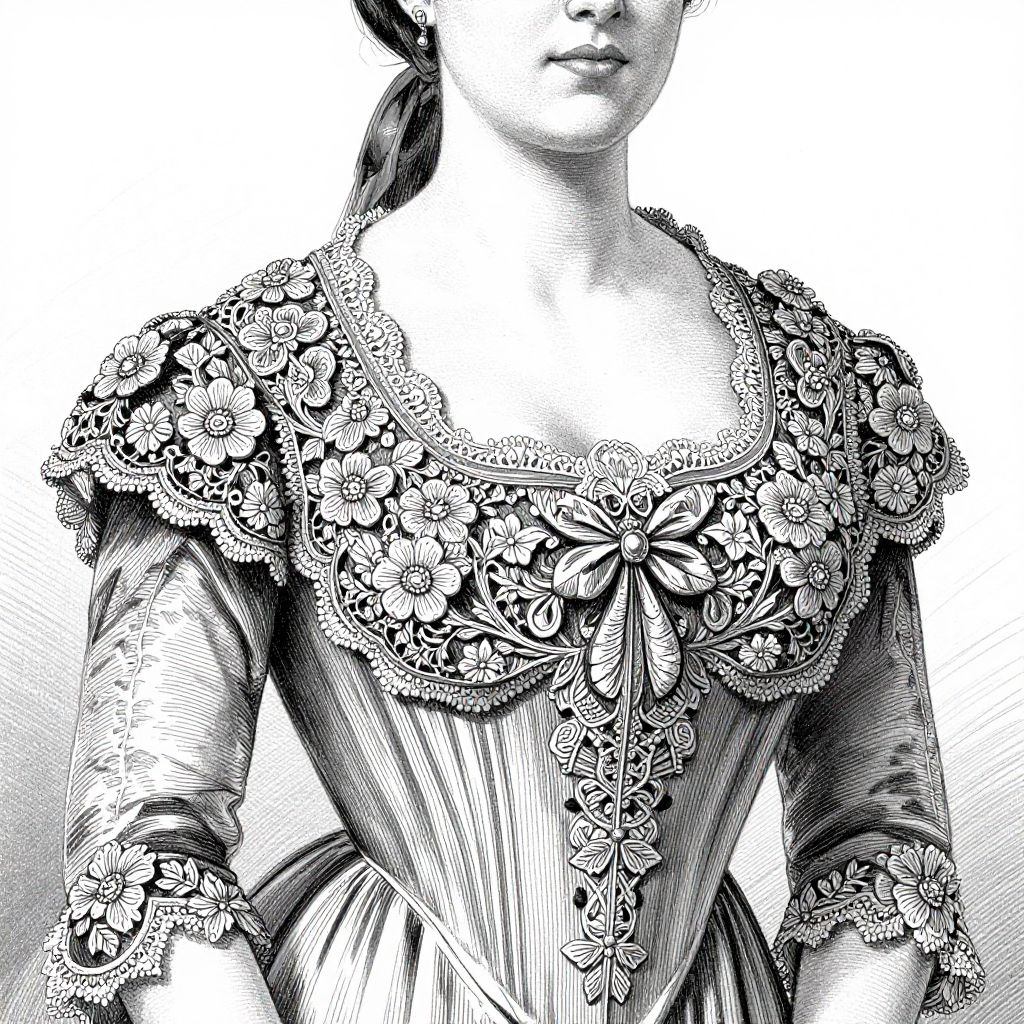 A meticulously detailed black-and-white illustration of a Victorian-era woman adorned in an elegant gown with intricate lace and floral embellishments, showcasing a refined and timeless fashion aesthetic through precise line work and shading techniques.