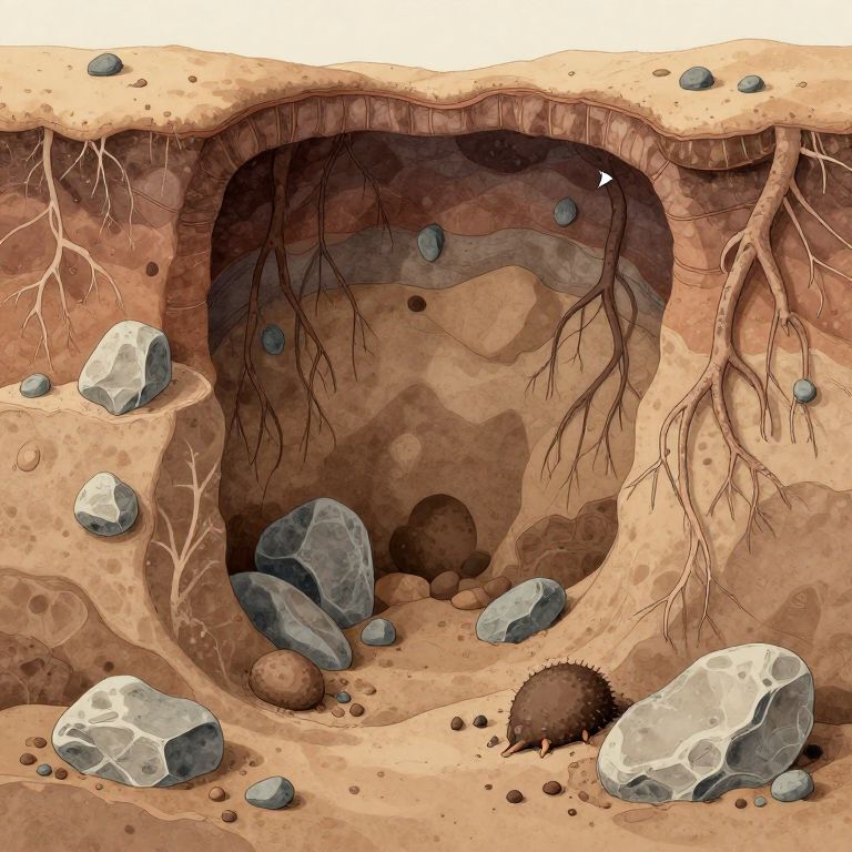 Cross-section view of a sinkhole underground, exposing intricate soil layers, rocks, roots, and burrowing creatures, scientific illustration style with annotated details, soft pastel color palette, educational and artistic blend.