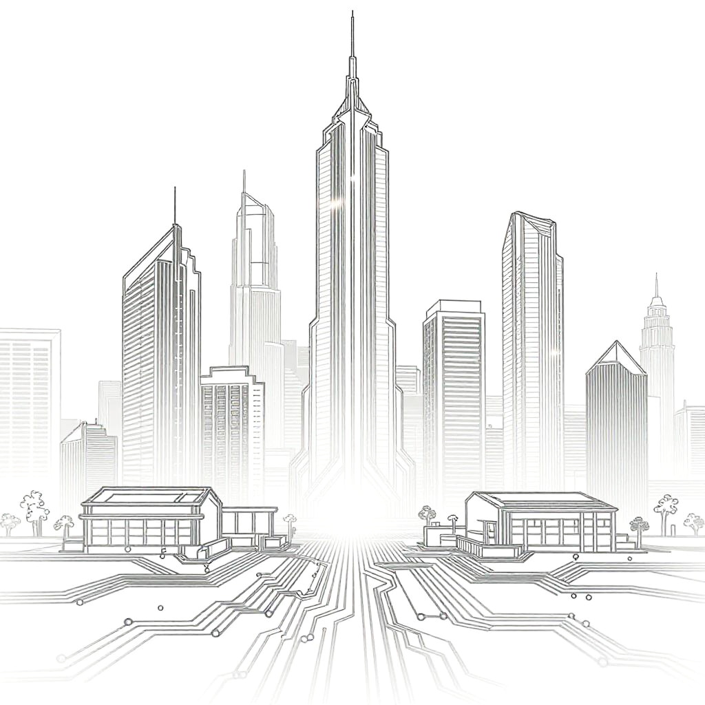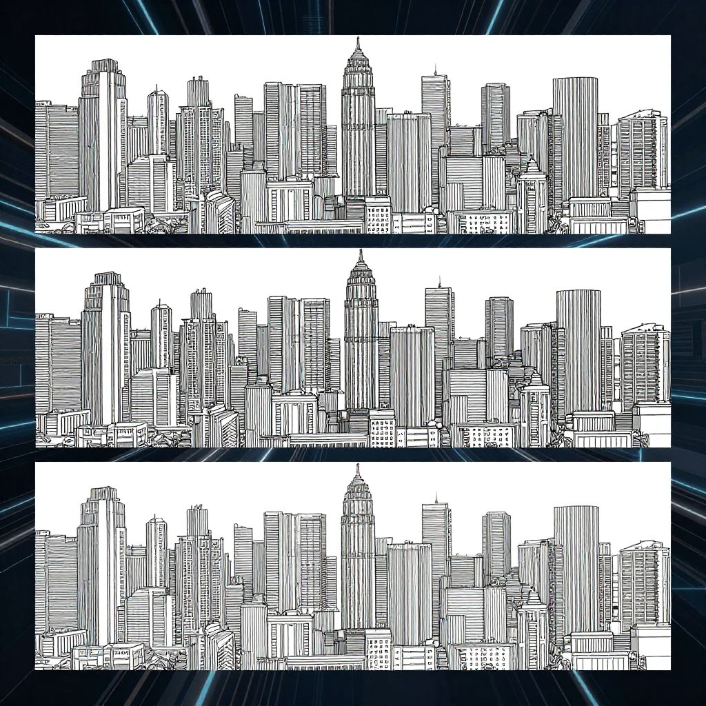 Photo to line art generator visualization, multi-step transformation of a dynamic cityscape image into bold, clean line art, highlighting precise contours and shading, modern graphic design environment with futuristic elements and subtle textures