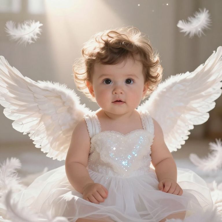 Angelic baby with sparkling eyes and soft curls, wearing a shimmering white gown, rays of sunlight illuminating the background, surrounded by soft feathers and a celestial glow