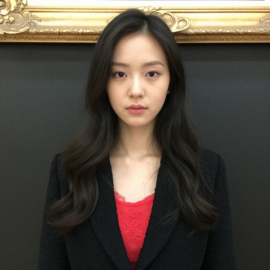 Photograph of an East Asian woman with long, straight black hair, light skin, and subtle makeup. She is wearing a black blazer over a red lace top. The background is a solid black wall, and a gold, ornately framed painting hangs above her head. Her expression is neutral, and she is centered in the frame, with the gold frame's intricate details contrasting with the simplicity of her outfit and the dark background.
