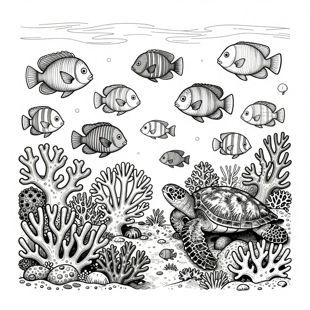 Realistic coloring page of an ocean coral reef scene filled with various fish species, sea turtles, and detailed coral formations, illustrated in detailed line work suitable for coloring to bring vibrant marine life to life on paper.