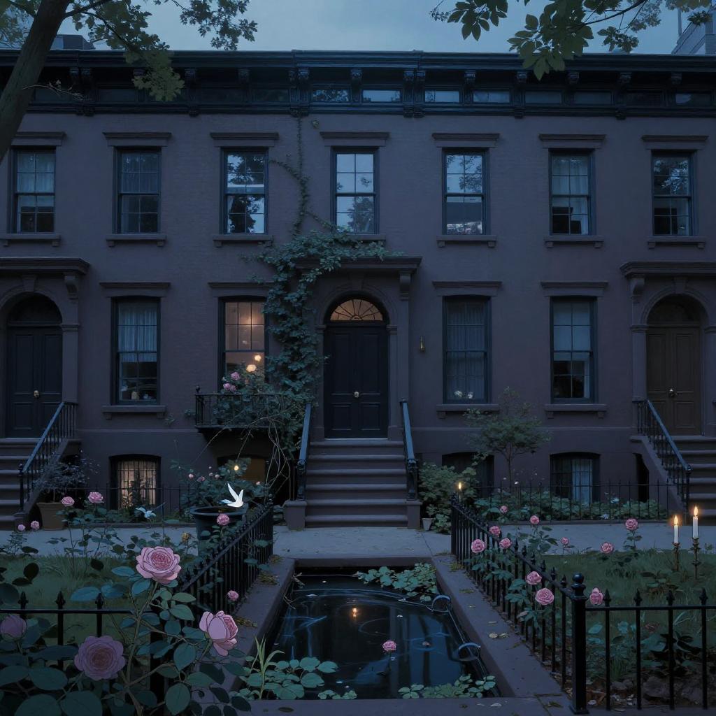Dreamlikeart between two 19th-century Brooklyn brownstone buildings, a surreal small twilight creek-garden, rose-brambles, candle-birds, tiny mystery-magic, serene overcast atmosphere, midnight-blue, blue-black, royal-blue, navy-blue, cel-shading, cinematic, edge-to-edge print, rendered by Studio Ghibli, Alyssa Monks, Andreas Rocha, David Kassan, Neil Blevins, Tuomas Korpi, ArtGerm