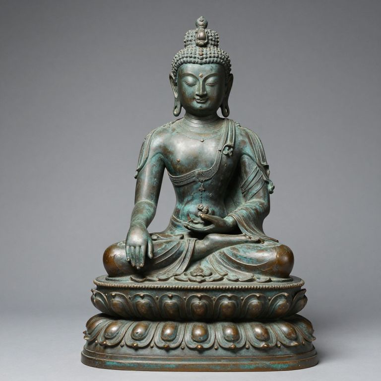 Photograph of a bronze Buddha statue sitting in a lotus position. The statue has a calm expression with closed eyes, detailed hair curls, and a serene smile. The Buddha wears a draped robe with intricate patterns, and holds a small, rounded object in its right hand, resting on its lap. The base of the statue is adorned with circular, bead-like designs. The statue has a greenish patina, indicating age. The background is a simple gradient from light to dark gray, highlighting the statue. The overall style is traditional Buddhist sculpture.