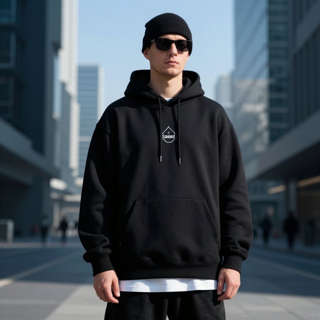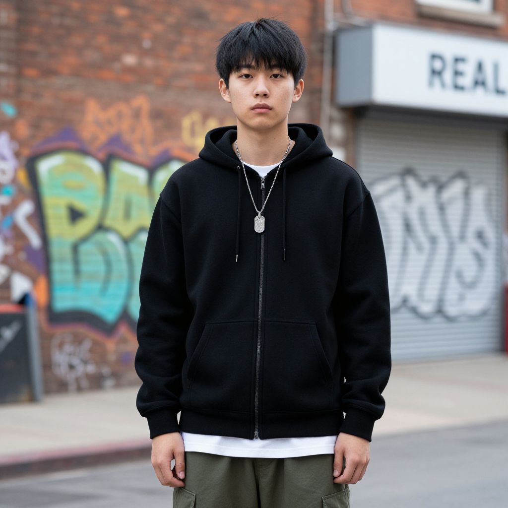Streetwear fashion, european man, a european man showcasing the latest in streetwear, in a futuristic cityscape with contrasting light and shadow, realistic photography with sharp focus and depth