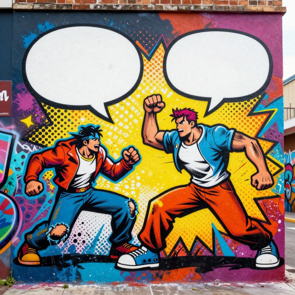 Street mural scene with a pop art filter effect, featuring comic strip-style speech bubbles, saturated colors with strong black borders, dynamic action pose figures, urban graffiti influence, layers of halftone dots and splattered paint textures