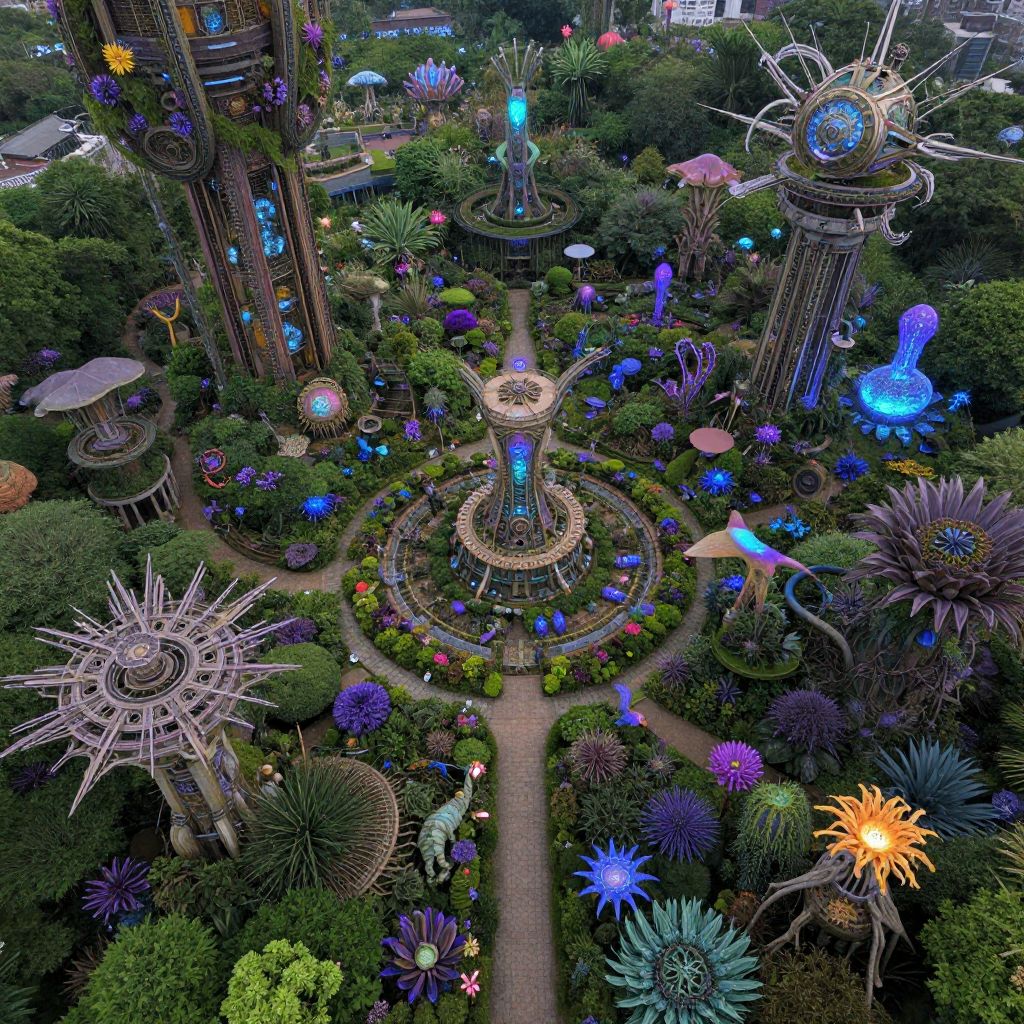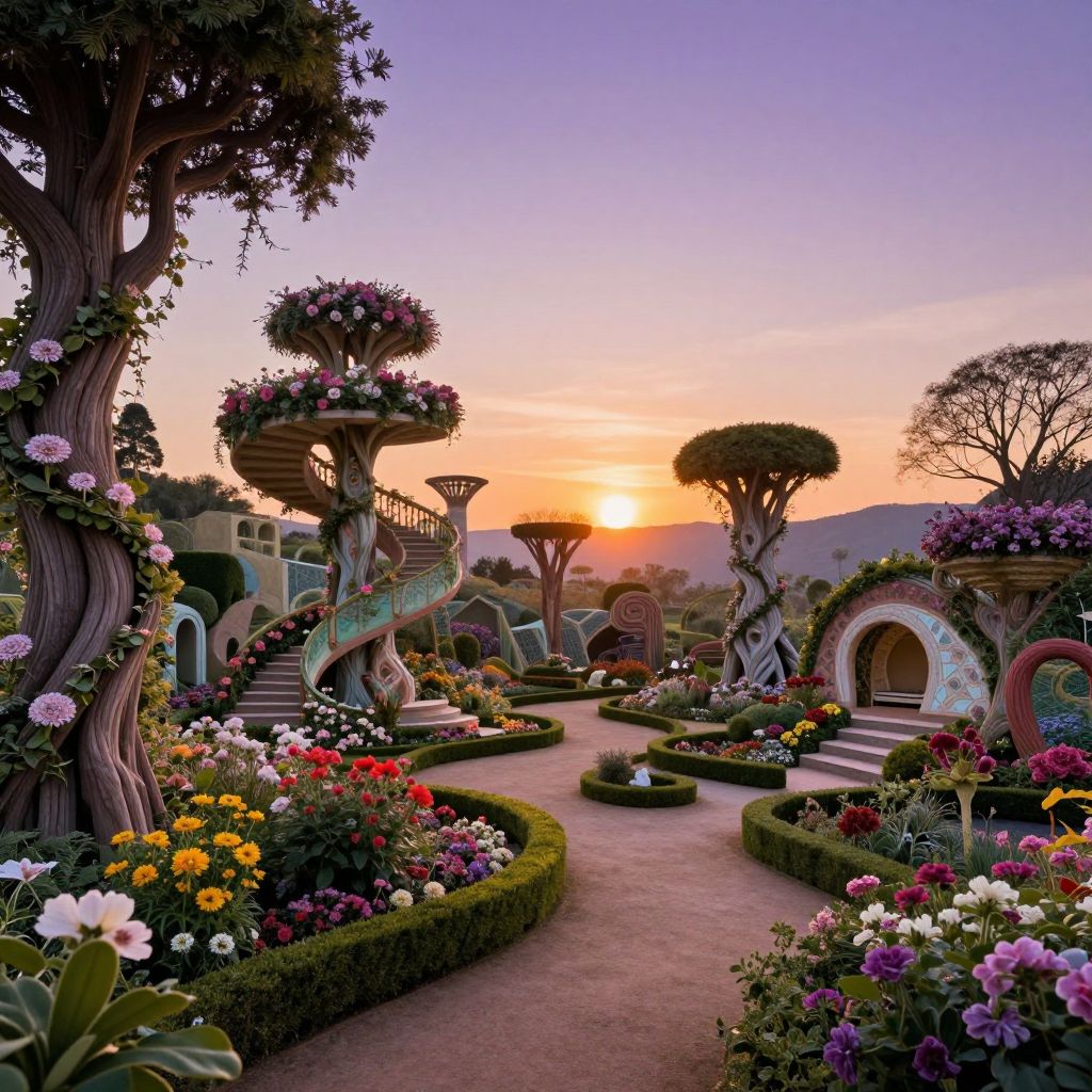 Aerial photograph of a vibrant, whimsical garden with circular flower beds, a central fountain, whimsical clock, and colorful ornaments amidst lush greenery