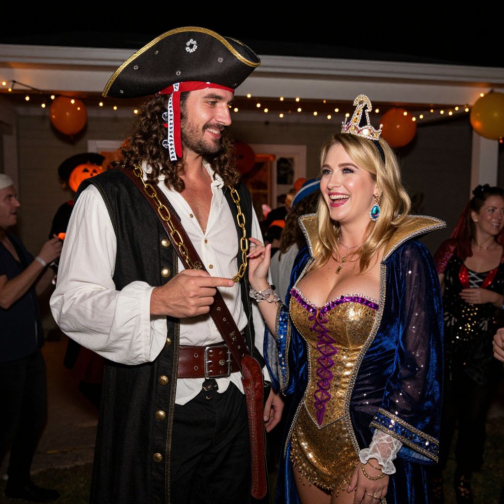 A lively Halloween-themed costume party at a dimly lit backyard with fairy lights, where a tall man in a majestic pirate costume with a large hat and gold chains stands next to a woman in a glittery queen regent outfit, both smiling and interacting with the crowd.. The woman has big tits and cute face