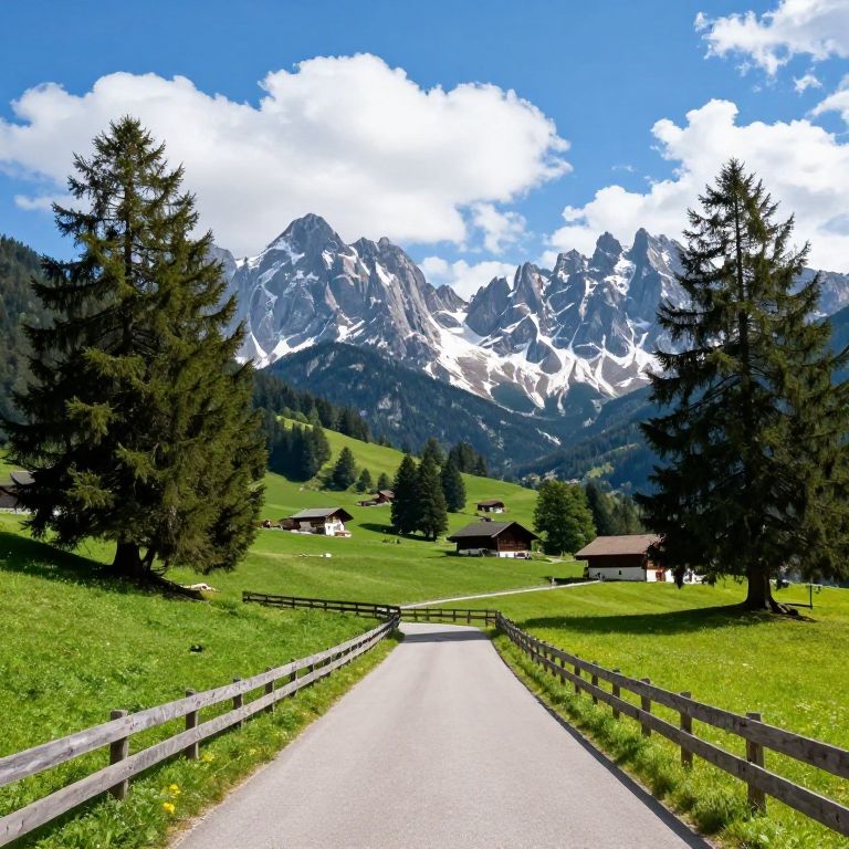 Photograph of a picturesque Alpine landscape. A winding road leads through a green meadow flanked by wooden fences on both sides. Tall pine trees frame the scene, with a backdrop of towering, snow-capped mountains under a bright blue sky with fluffy white clouds. Small, cozy houses are scattered in the distance, nestled among the trees. The overall vibe is serene and inviting.