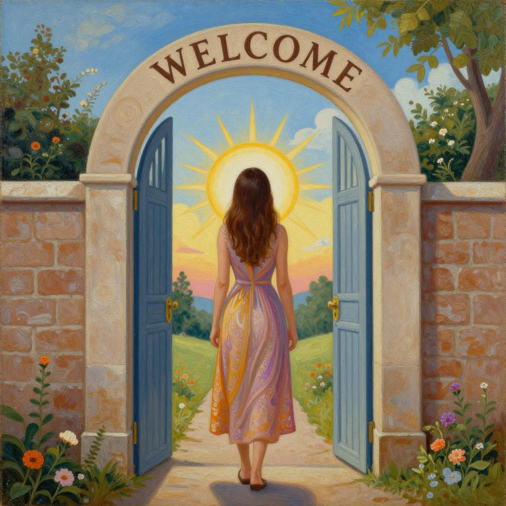Cartoon-style image of a smiling woman in a blue dress standing in a glowing yellow doorway with "WELCOME" above, flanked by palm trees