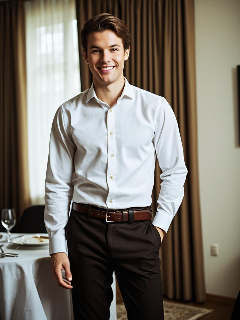 Portrait of a young Caucasian man with brown hair wearing a white collared long-sleeve formal shirt and black pants with a brown belt. He is smiling and standing indoors next to a dining table with cutlery and a wine glass, with brown curtains in the background.