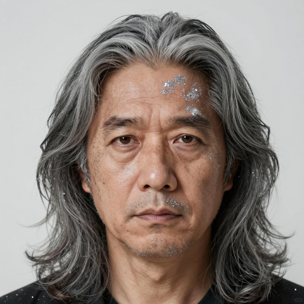Man with long, slicked-back gray hair, wearing a black leather vest and brown long-sleeve shirt, extends right arm, covers mouth with left hand. Dark background. Metallic bracelet on left wrist. Intense expression. Side profile.