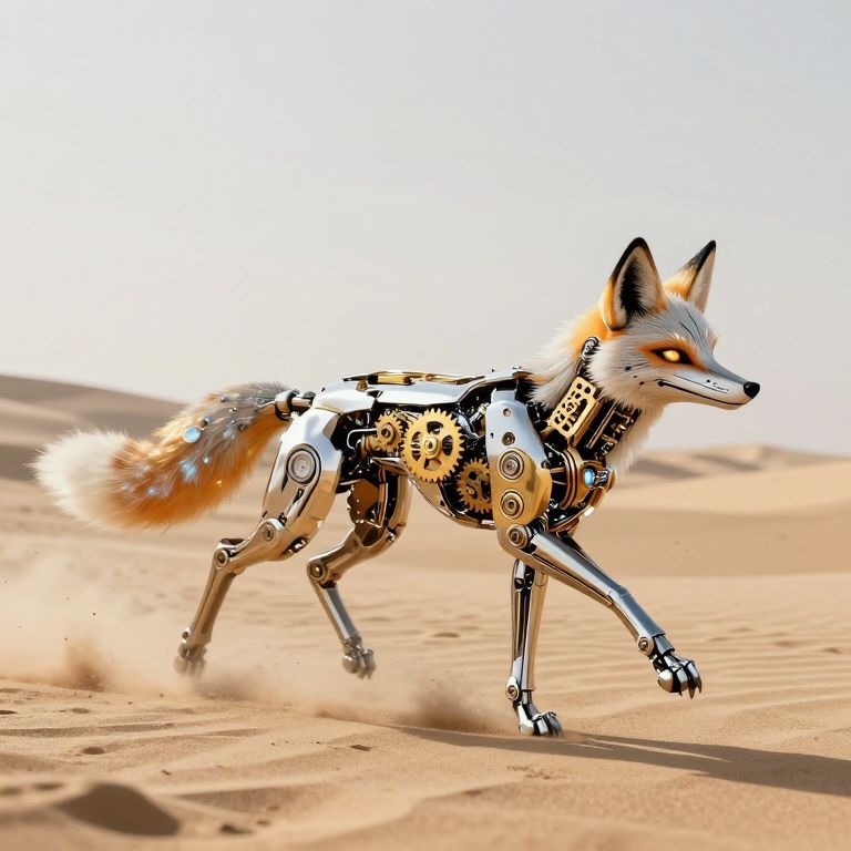 Photorealistic digital artwork of a cybernetic fox with a sleek, metallic body composed of interlocking gears, cogs, and wires. The fox's fur is a mix of orange, white, and black, with glowing orange eyes. It strides through a sandy desert with blurred dunes in the background, creating a sense of motion. The fox's tail is fluffy and orange-tipped. The metal parts of its body are shiny and reflective, contrasting with the soft texture of the sand. The overall style combines elements of science fiction and realism.