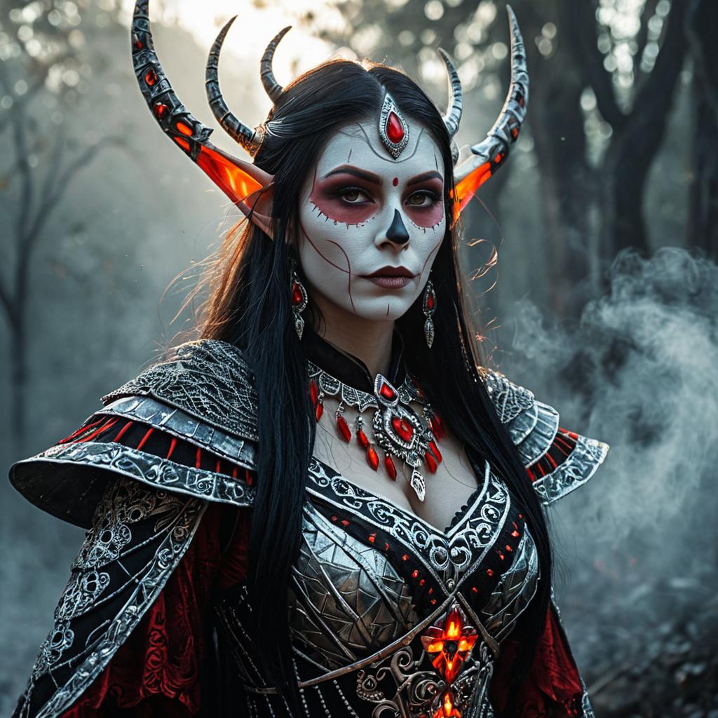 Intricate armor, photo realistic, ultra details, natural light, ultra detailed portrait of a female sorceress, enchanted plate, glowing eyes, la Catrina dia de los muertos, volumetric fog, Hyperrealism, breathtaking, ultra realistic, ultra detailed, cinematic lighting, highly detailed, breathtaking, photography, stunning environment, sexy
