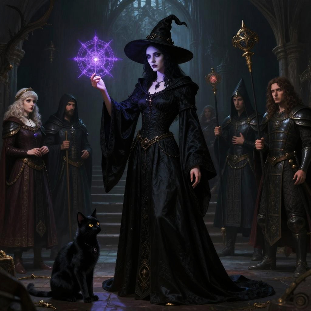 Modelshoot style, (extremely detailed CG unity 8k wallpaper), full shot body photo of the most beautiful artwork in the world, english medieval witch, black silk vale, pale skin, black silk robe, black cat, necromancy magic, sexy, medieval era, photorealistic painting by Ed Blinkey, Atey Ghailan, Studio Ghibli, by Jeremy Mann, Greg Manchess, Antonio Moro, trending on ArtStation, trending on CGSociety, Intricate, High Detail, Sharp focus, dramatic, photorealistic painting art by midjourney and greg rutkowski