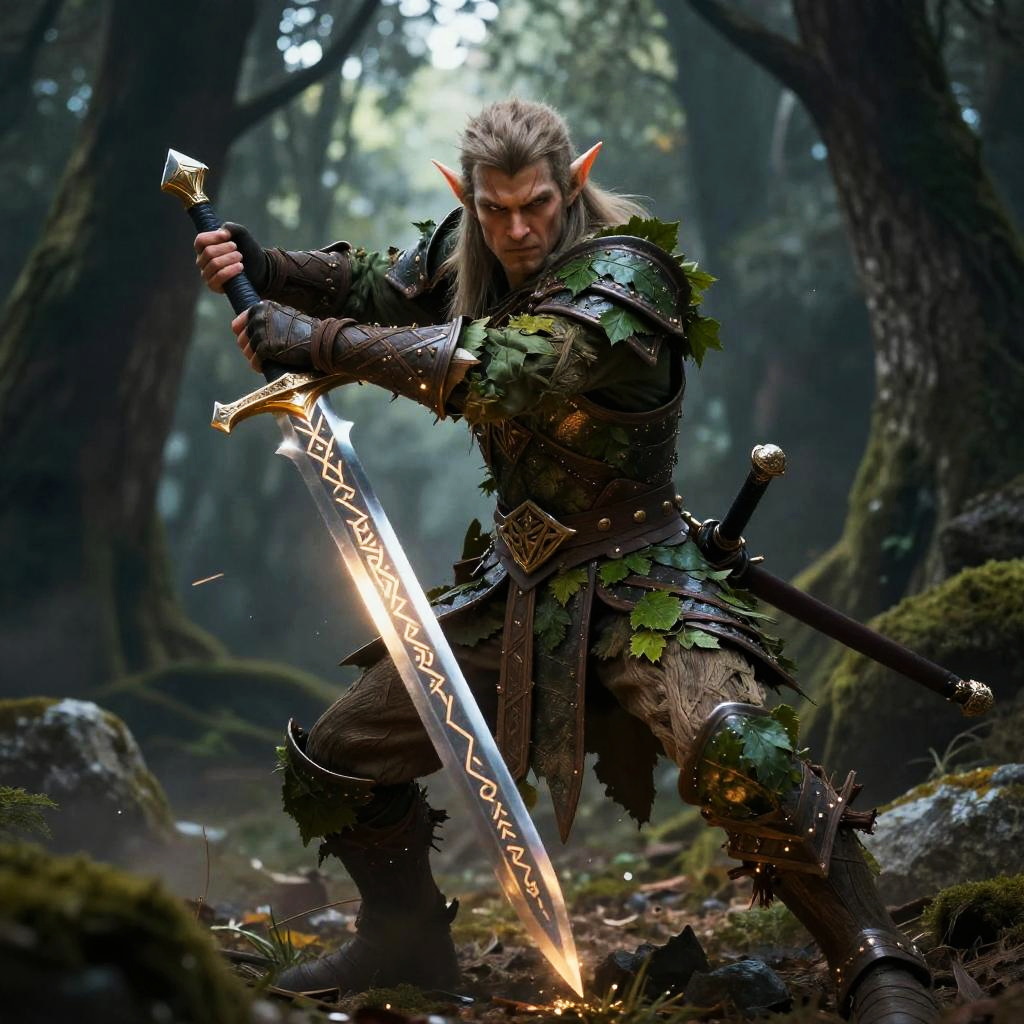 Epic fantasy CGI: Elf warrior in leafy armor, wielding a glowing, intricate sword, crouches in a misty forest, ready to