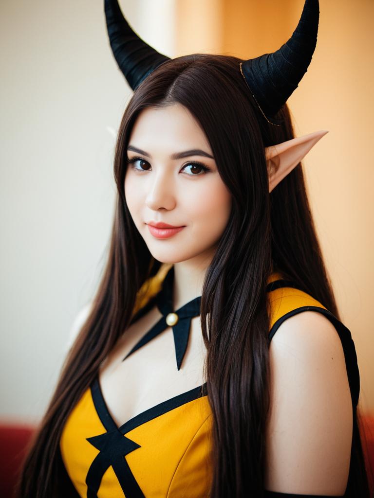 Photo-realistic cosplay photo of person in arulumaya costume. 1girl, pointy ears, brown eyes, mole under eye, long hair, brown hair, black hair, small breasts, harvinlifestyle stock photo, shallow depth of field, lifestyle stock photography, shallow depth of field, natural lighting, warm tones, soft background blur, candid moments, vibrant colors, realistic textures, modern casual clothing. full body shot
