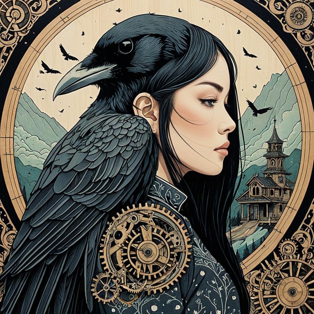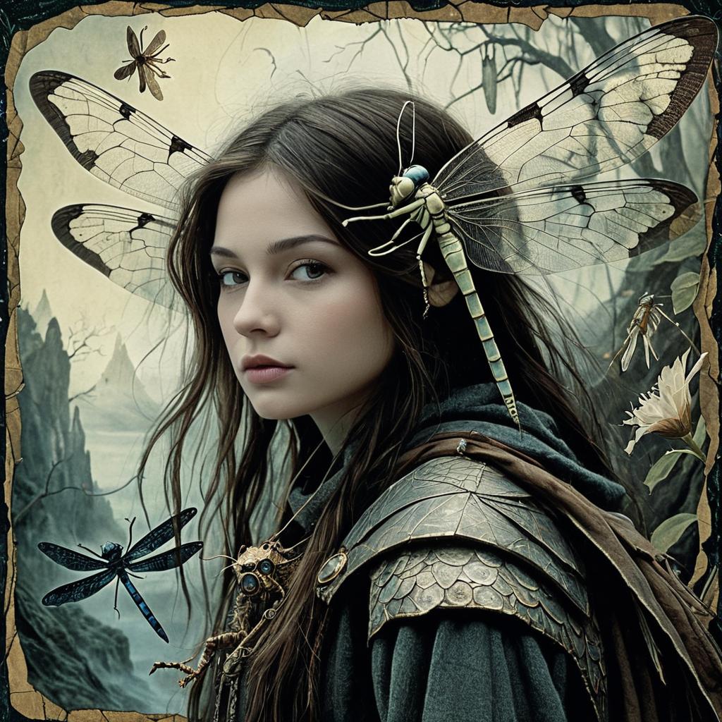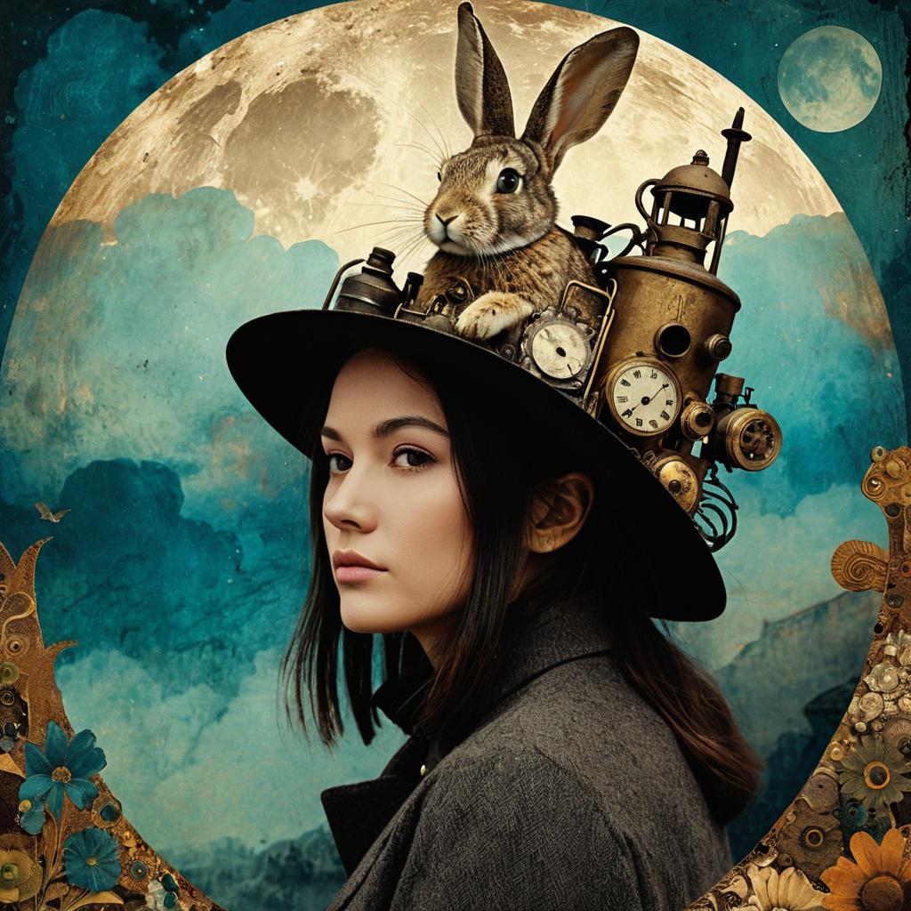 A haunted explorer with a memory that survives the great cataclysm and a small steam-powered rabbit on her shoulder. Collage artwork inspired by Odilon Redon, combining surreal and dreamlike elements with intricate textures and layered imagery. The artwork blends resilience with a mixed-media aesthetic, capturing an atmosphere of mysterious serenity.