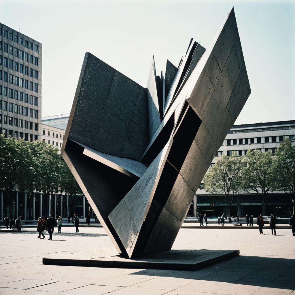 A large post-modern sculpture with a deconstructed form made of metal panels, located in a contemporary public plaza. The sculpture features angular, irregular shapes with a hollow center, showcasing a play of light and metal texture that mimics ruined materials. Surrounded by historical buildings and trees, the scene is captured with a vintage photographic style.