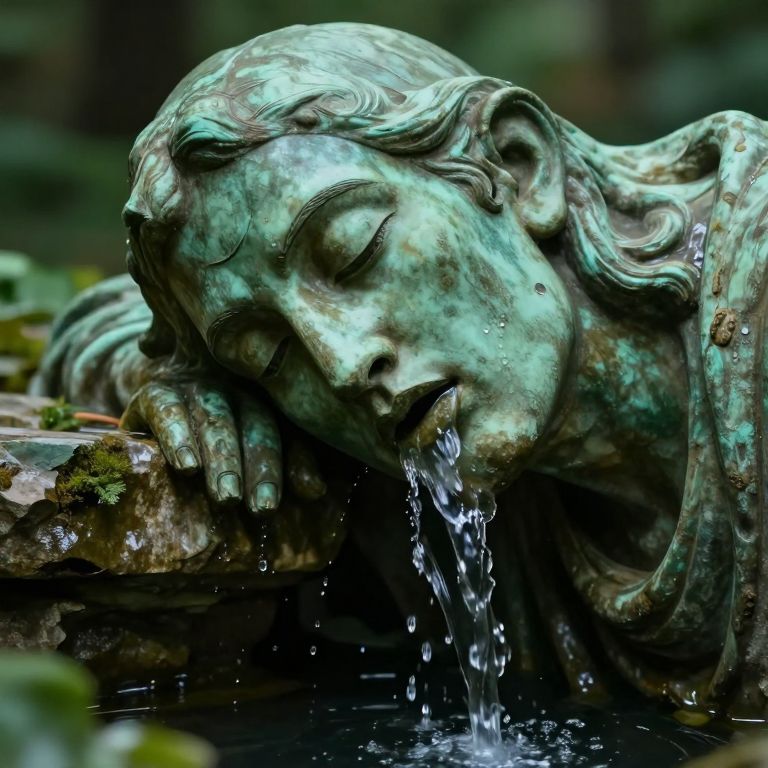 Time whispers its secrets through the verdant patina of a slumbering philosopher's visage, as a steady stream of water cascades from his lips—a symbol of eternal wisdom flowing into the unknown, inviting reflection amidst the quiet embrace of nature.