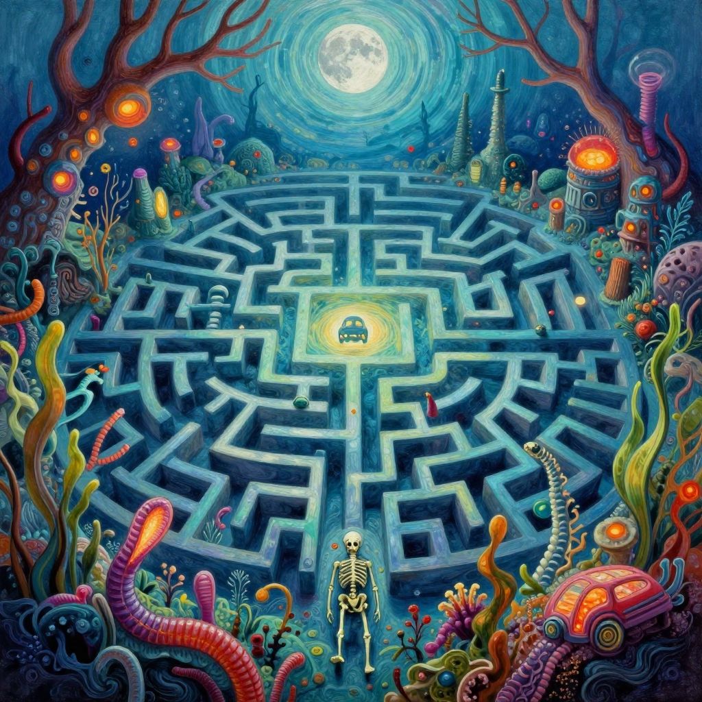 Underwater maze, ((masterpiece, high quality, best quality, 8k, wallpaper, fine lineart, highly detailed)), magical style land art style hyperrealistic, vivid colors, intricate details, realistic style, oil paintings, acrylic paintings, watercolor paintings, digital illustrations, mixed media pieces, sculptures casting shadows, ( lunar:0.7), photorealistic, extreme detail, (lifelike:1.4), crisp, precise, detailed blend of organic and magical elements, ( vaporwave:0.9), translucent colors, ( vast underwater landscape:1.5), thermal vents, branches, worms eye view, thick underwater shrubs, ( seaweed:1.3), worms, bio luminous, ( car with a skeleton:0.3)