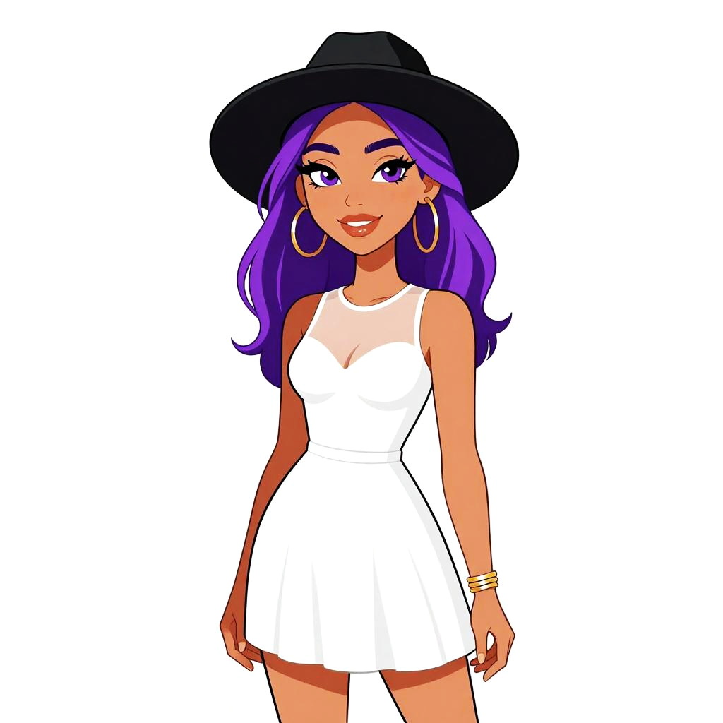 Woman with pretty face and pretty hair. Woman, modern casual, black fitted scoop neck t-shirt, short sleeves, bright orange high-waisted skater skirt, thigh length, pleated detail, gold chunky chain necklace, gold bracelet, plain white studio background --sref 1467