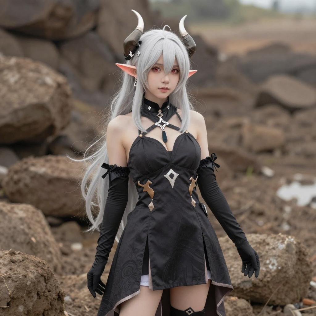 Photo-realistic cosplay photo of person standing in mudrock (silent night) (arknights) costume. 1girl, pointy ears, horns, red eyes, very long hair, white hair, grey hair, long hair, hair flower, large breasts, cleavage, thighs, navel, black bikini, bare shoulders, black choker, necklace, oripathy lesion (arknights), material growth, infection monitor (arknights), stomachfull body shot. lifestyle stock photo, shallow depth of field, lifestyle stock photography, shallow depth of field, natural lighting, warm tones, soft background blur, vibrant colors, realistic textures, professional photoshoot