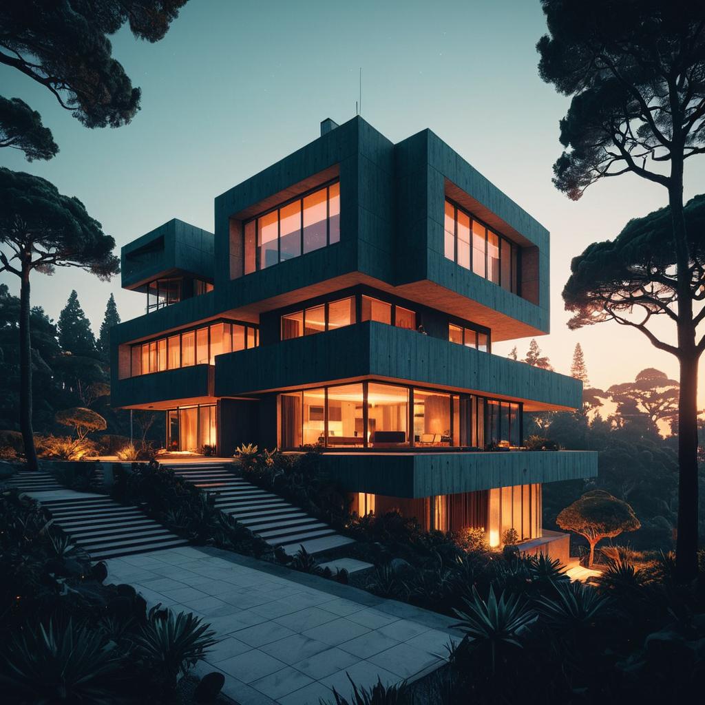 A luxurious house with brutalist architecture, inspired by Marcel Breuer, glowing lights, trees at sunset, concept art by Mike Winkelmann (Beeple), trending on ArtStation