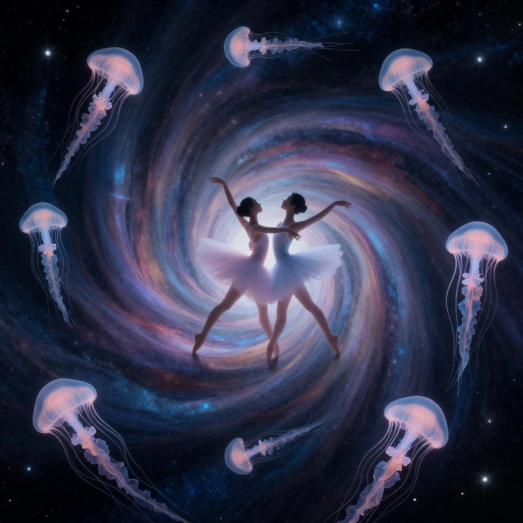 A surreal illustration of an orchestra of floating jellyfish-lanterns performing on a crescent stage, with ribbon-like musical notes of light, bioluminescent tentacle-strings, drifting ink-droplets, and a tiny conductor moth waving a silver baton, in a foggy harbor at dusk with paper-sail boats and a double moon reflected on glassy water, created in luminescent watercolor with delicate ink-line surrealism, dreamlike and captivating