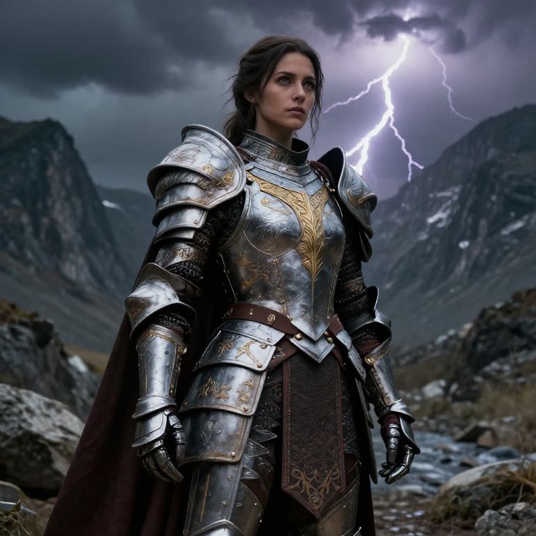 A digital artwork depicts a stern-faced woman with dark, wavy hair, standing in a rocky, mountainous landscape under a stormy sky with a bright lightning bolt. She wears ornate, silver medieval armor with gold emblem designs on the chest plate and gauntlets. A dark, patterned cloak flows from her shoulders. Her gaze is intense, and her posture is strong. The background includes jagged rocks and distant mountains, adding to the dramatic atmosphere. The overall color palette is dark and moody, with metallic silver armor contrasting against the dark, cloudy sky.