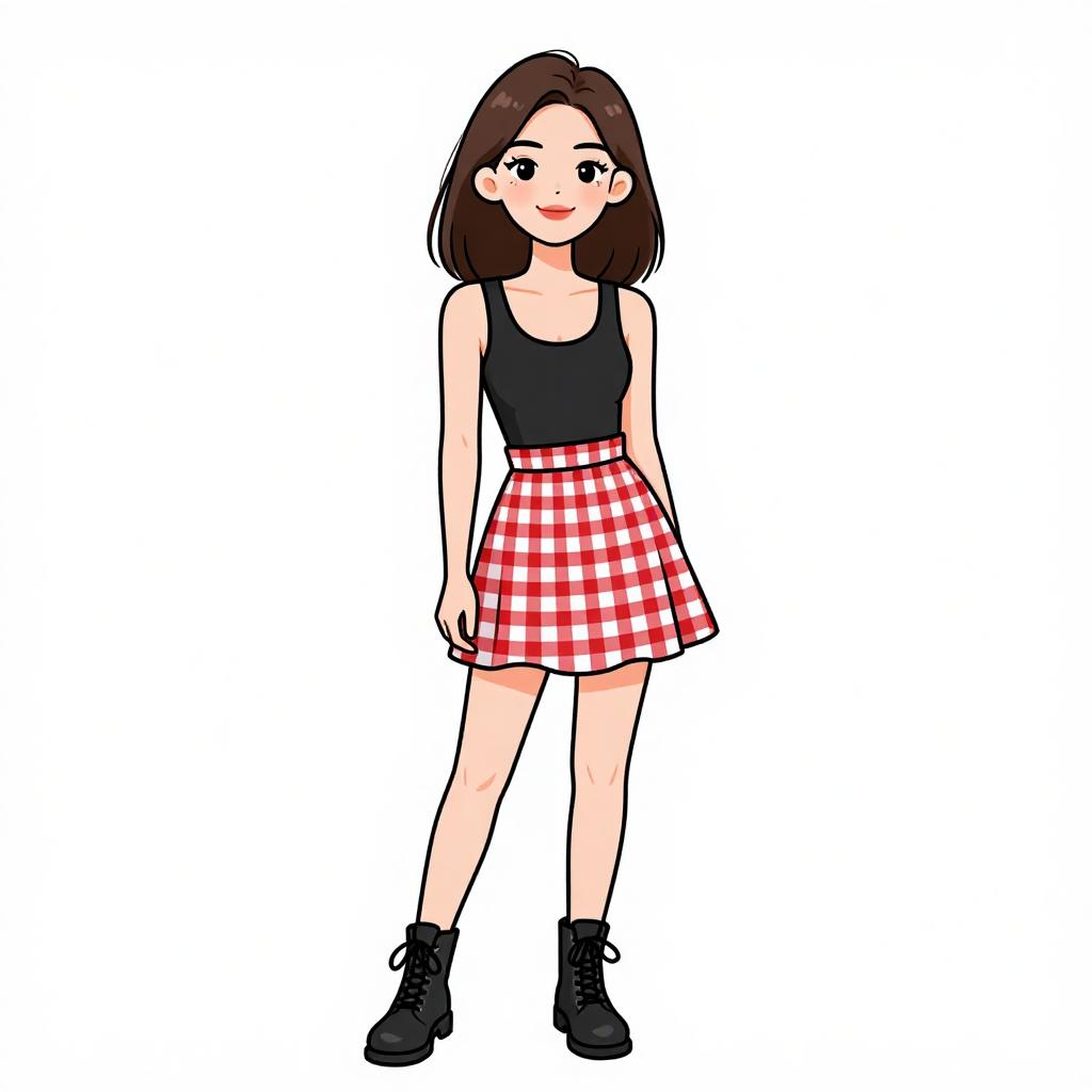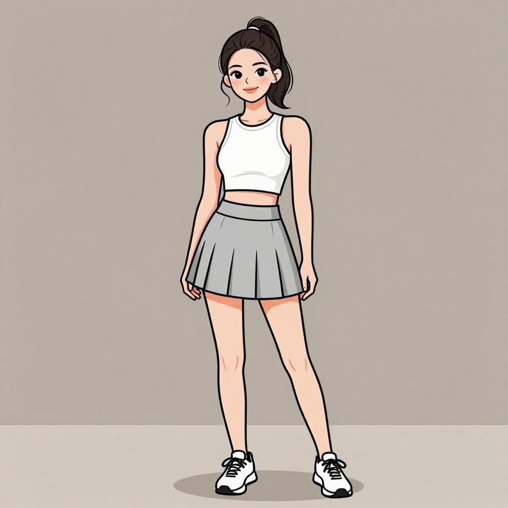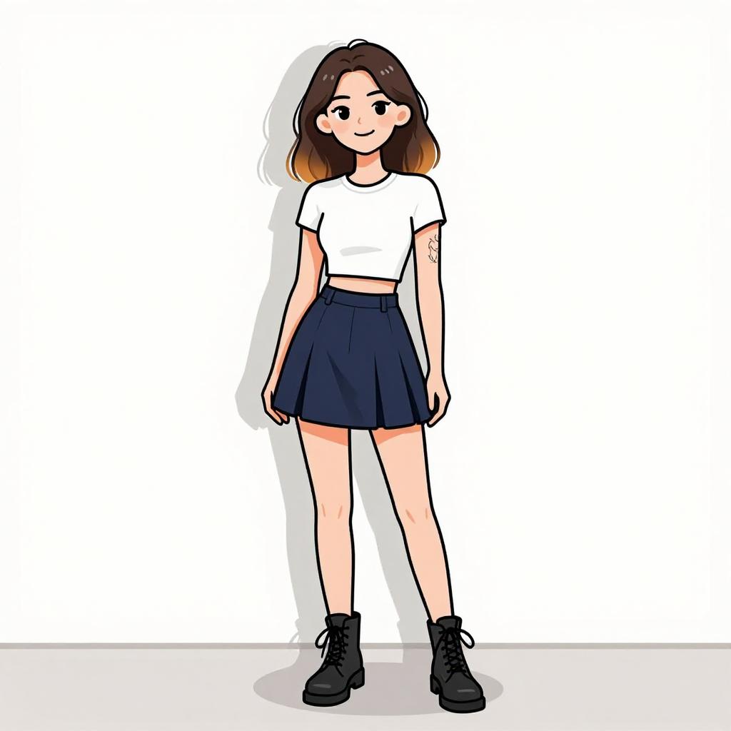 Woman with pretty face and pretty hair. smiling Woman, casual street style, white ribbed crop top, short sleeves, high-waisted pleated mini skirt in navy blue, black lace-up ankle boots, minimal tattoos on arm, ombré hair, plain white wall background. --sref 1467